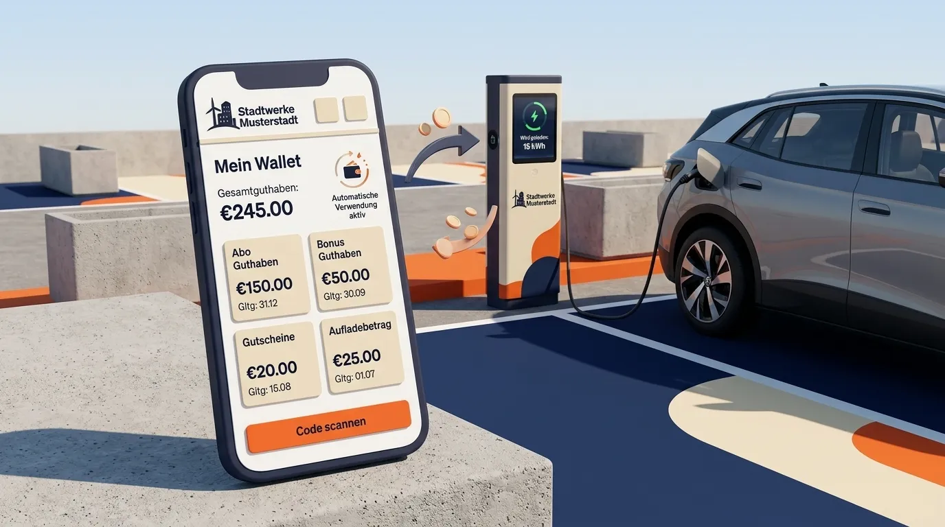 Das System nimmt Ihren Kund:innen das Mitdenken ab: Vorhandenes Guthaben wird bei Ladevorgängen automatisch priorisiert. Reicht das Guthaben nicht aus, wird der Differenzbetrag nahtlos über die hinterlegte Zahlungsmethode abgerechnet.